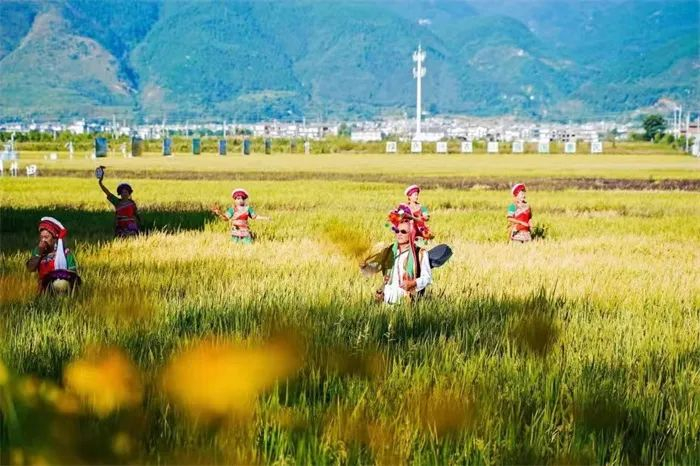 活动开幕当天,走进古生村云南农垦“云粮·洱海留香”绿色有机种植基地,一片片黄绿相间的水稻长势喜人,禾秆被沉甸甸的稻穗压弯了“腰”。村民们身着白族服饰,在稻田边跳起欢快的舞蹈喜迎丰收。