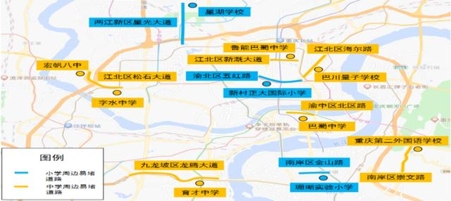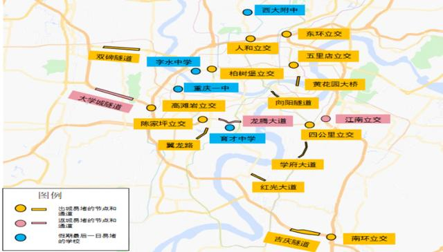 中学方面,九龙坡区育才中学周边的龙腾大道,江北区字水中学和宏帆八中周边的松石大道,江北区巴川量子学校周边的海尔路,江北区鲁能巴蜀中学周边的新溉大道,南岸区重庆第二外国语学校周边的崇文路等中学周边主干道路将呈现时段性拥堵,预计从16时30分左右开始,至17时20分左右趋于消散。