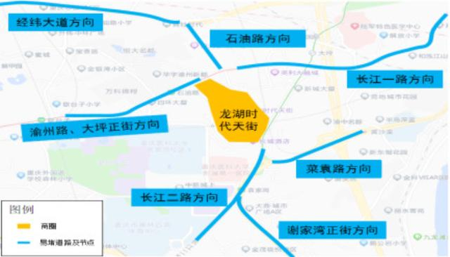 一是时代天街商圈。预计与龙湖时代天街商圈北边相邻的经纬大道、石油路,东边相邻的长江一路,南边相邻的菜袁路、长江二路、谢家湾正街,西边相邻的大坪正街、渝州路等商圈周边道路易出现拥堵缓行,拥堵时段集中在12时至21时30分。