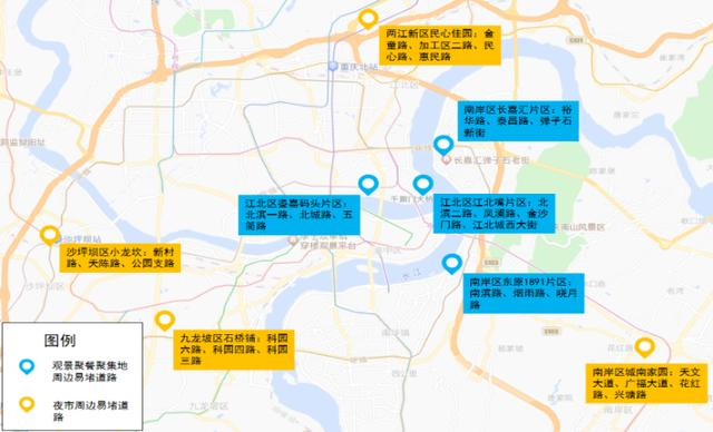 (4)聚会聚餐高峰。节前最后一个工作日,晚高峰外出聚会聚餐的群众增多,特别是两江四岸的观景聚餐聚集地和网红夜市周边道路将迎来第四波出行高峰。观景聚餐聚集地方面,南岸区长嘉汇片区、东原1891片区,江北区鎏嘉码头片区、江北嘴片区等周边道路将呈现时段性拥堵,预计从18时左右开始,至21时左右趋于消散;网红夜市方面,两江新区民心佳园夜市、南岸区城南家园夜市、九龙坡区石桥铺夜市等周边道路将呈现时段性拥堵,预计从20时左右开始,至22时左右趋于消散。