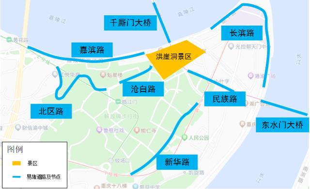 一是洪崖洞景区。预计18时左右至24时左右,与洪崖洞景区北边相邻的千厮门大桥,东边相邻的长滨路、东水门大桥,南边相邻的民族路、沧白路、新华路,西边相邻的嘉滨路、北区路等主要道路和桥梁易出现拥堵缓行。