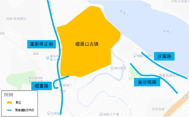 二是磁器口古镇。预计10时左右至15时30分左右,与磁器口古镇东边相邻的金沙南路、沙滨路,西边相邻的童家桥正街、磁童路等主要道路易出现拥堵缓行。