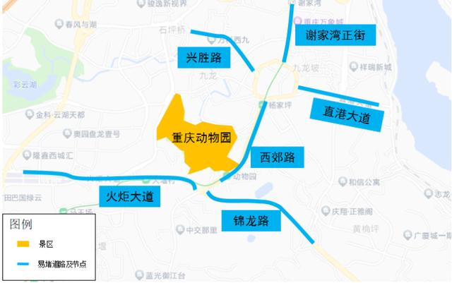 三是重庆动物园。预计9时左右至16时30分左右,与重庆动物园北边相邻的谢家湾正街、直港大道、兴胜路,南边相邻的西郊路、锦龙路、火炬大道等主要道路易出现拥堵缓行。