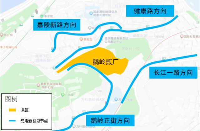 四是鹅岭贰厂。预计13时30分左右至18时左右,与鹅岭贰厂北边相邻的健康路,东边相邻的长江一路,南边的鹅岭正街,西边的嘉陵新路等主要道路易出现拥堵缓行。