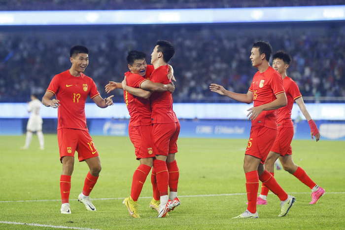 9月27日,中国队球员陶强龙(左三)进球后和队友庆祝。新华社记者 胡星宇 摄