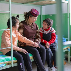 ▲2022年2月25日,新疆某寄宿制小学的学生在宿舍和生活老师聊天。图/新华社
