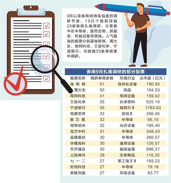 东方财富Choice数据显示,9月以来券商保持高强度的调研节奏,19只个股获得超25家券商扎堆调研,主要集中在半导体、医药生物、新能源、机械设备等领域。人气最高的股票分别是埃斯顿、周大生、南网科技、卫星化学、宁波银行,均被超35家券商集中调研。
