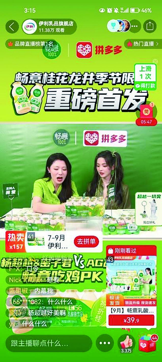 在“国货节”上线当天,国货乳业品牌伊利在拼多多平台独家首发了旗下的畅意100%新品,并把新品发布会搬到了拼多多旗舰店的直播间,畅意100%的品牌代言人杨超越也现身直播间,为这款“桂花龙井”新口味乳酸菌产品打call,还为直播间的网友送出了1元秒杀、明星限量款周边产品等福利。