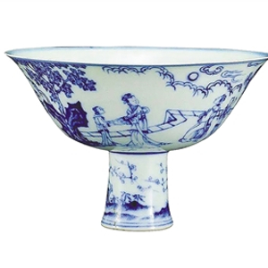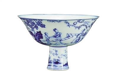 瓷锺又称高足碗,有着十分丰富的文化内涵,象征着尊贵、权威和终身幸福。这件瓷锺是明代梁庄王妃的日用器皿,还有银鎏金托盏与金锺盖,2001年出土时托盏的主体尚存,锺盖的主体已经全朽。但瓷锺上怡然有趣、清新典雅的图案,展现着古人对美好幸福生活的追求。