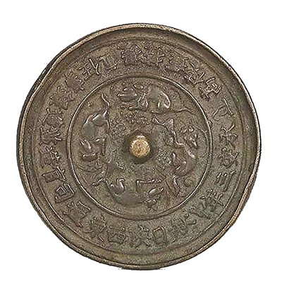 相比唐宋铜镜,金代铜镜造型厚重宽大,镜纽以尖平顶的圆纽为主,背面纹饰多采用高浮雕手法,线条错落有致。受冶炼技术影响,金代铜镜含锡量减少,含锌量提升,色泽泛黄,这点已成为鉴别金代铜器的重要参考。金代铜镜纹饰以双鱼、人物故事、花鸟瑞兽等较为多见,素以形象生动、构图匀称、纹饰清晰见长。文中中秋日铜镜,属于比较有代表性的瑞兽花鸟纹铜镜。铜镜以镜纽为中心,4只瑞兽逆时针追逐,在空白地带使用葡萄纹点缀。