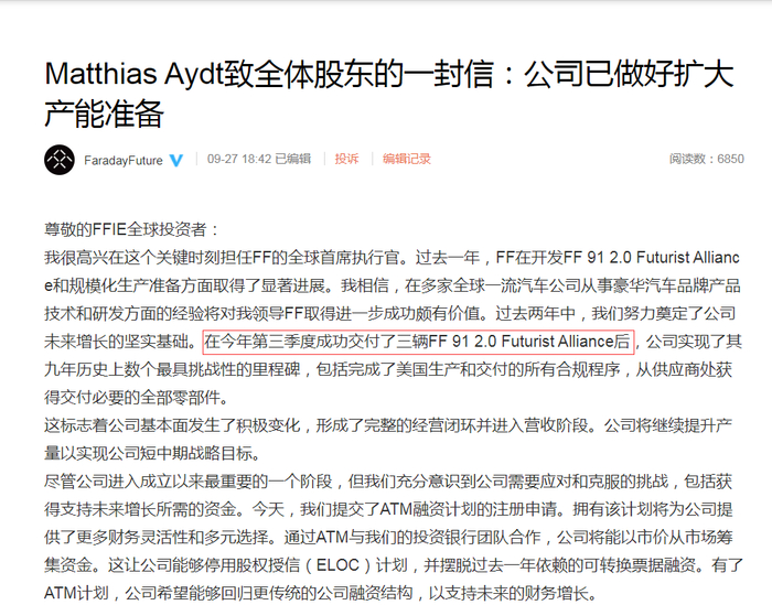 9月27日,Faraday Future(法拉第未来,下称“FF”)官方公布了FF全球首席执行官Matthias Aydt致全体股东的一封信。
