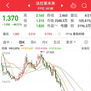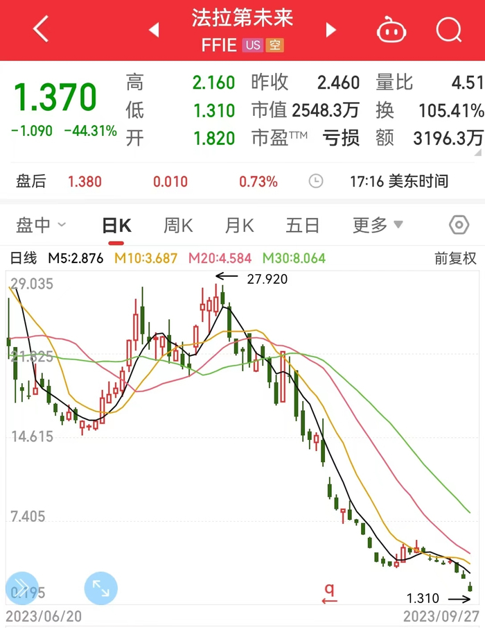 近一个月来,法拉第未来股价节节下跌,截至当地时间9月27日收盘,法拉第未来报1.37美元,跌幅44.31%。其市值跌破3000万美元关口,最新报2548.3万美元。