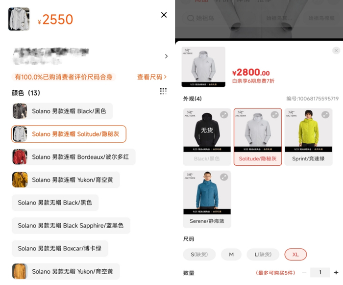 另一边,因为国内市场价格较高,一些喜欢穿鸟的人,开始盯上了海外代购。潘哥在淘宝发现,加拿大代购的Solitude,售价2550元可讲价;而在京东旗舰店内,同款服装一口价2800元。