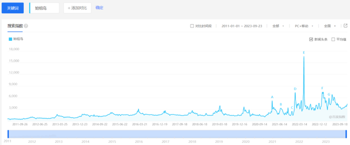 潘哥发现,在百度搜索指数中,始祖鸟在2020年之前,一直都是不温不火,之后突然流量剧增,并在2022年年中达到顶峰,至今仍处于高位。