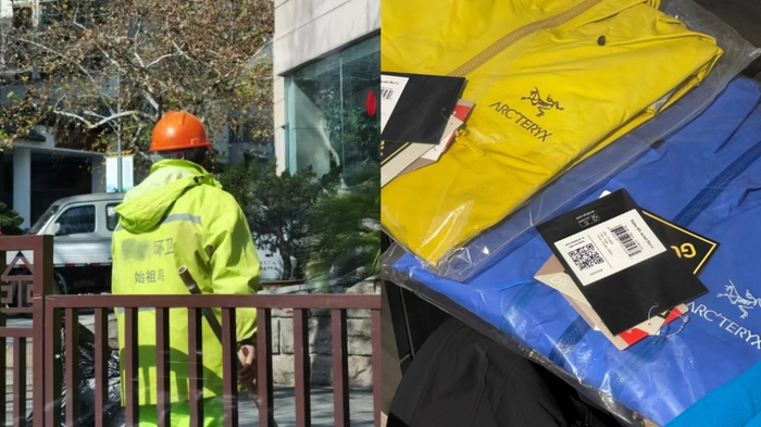 流行单品始祖鸟,甚至成了一些人的工服,潘哥发现:有的环卫工人制服上,就赫然印着:始祖鸟;还有人买来黄蓝两款冲锋衣,表示送外卖时换着穿。