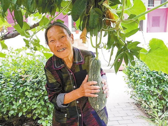 三河市段甲岭镇五福养老院,专门为老人们开辟了蔬菜种植区。在工作人员的指导下,老人们种植了一些自己喜欢吃的蔬菜。亲手栽培蔬菜的过程,增进了老人们的情感交流和健康养生,大大提升了老年人的幸福指数。图为一位老人正在采摘南瓜。本报通讯员 刘洪康 文君文/图