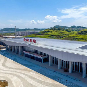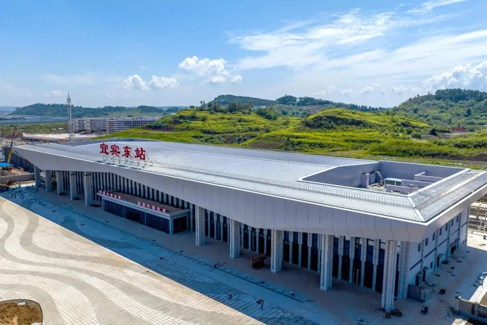 宜宾东站站房整体以“峰叠水长,腾飞之翼”为主题,外观建筑勾勒出雄鹰振翅欲飞的造型,建成运营后,将极大方便周边居民出行。