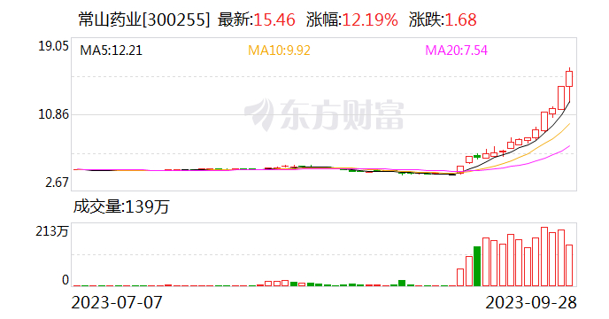 常山药业的股票价格自2023年9月11日至2023年9月27日累计涨幅已达210.36%,远高于同期创业板综合指数-1.86%的变化幅度。