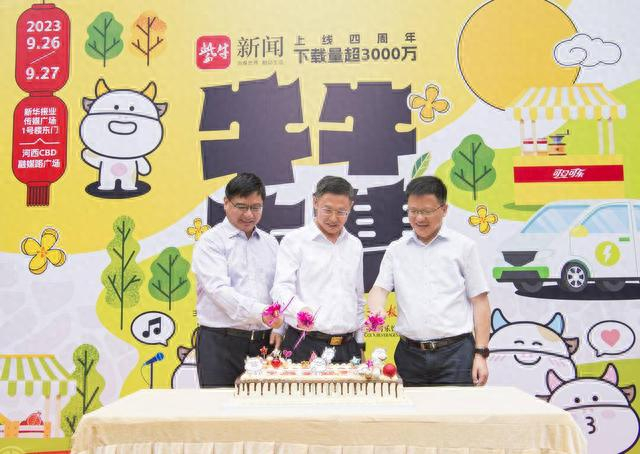 在市集开幕式现场,新华日报社党委书记、社长、新华报业传媒集团董事长双传学,新华日报社党委副书记、总编辑顾雷鸣,湖南日报社党组书记、社长、湖南日报报业集团有限公司党委书记、董事长姜协军一起登台为紫牛新闻上线四周年切蛋糕。