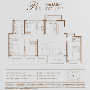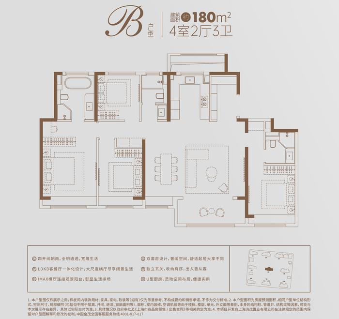 五开间朝南的全明通透,四房两厅三卫,双主卧设计,舒适起居大享不同,使得其居住感相当阔绰,为生活增添更多情景体验。在精巧铺排上,LDKB客餐厅一体化设计,大尺度横厅尽享阔景生活;动线合理的基础之上,户型格局方正,赋予生活幸福美感。
