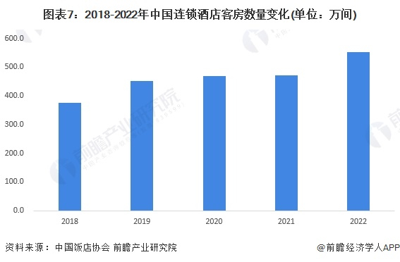随着连锁酒店数量的增加,连锁酒店客房数量也随之增长。根据中国饭店协会数据显示,2018-2022年中国连锁酒店客房数量整体呈上升趋势,2022年中国连锁酒店客房数量超550万间。