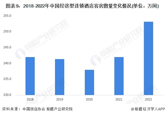 根据中国饭店协会数据显示,2018-2022年中国经济型连锁酒店客房数量整体呈波动趋势。受新冠疫情爆发的影响,2020年中国经济型连锁酒店客房数量大幅下滑。但随着国民经济恢复以及新冠疫情影响减弱,2022年中国经济型连锁酒店客房数量超253万间,已经高于2018年的高点。