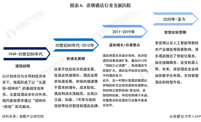 中国连锁酒店行业的发展主要经历了4个阶段,随着国民收入的持续增长和连锁酒店业发展经验的积累,连锁酒店行业已经从建国初期的探索阶段,迈入升级转型阶段,尤其是在数字化变革浪潮的带动下,智慧酒店正在加速推进建设。