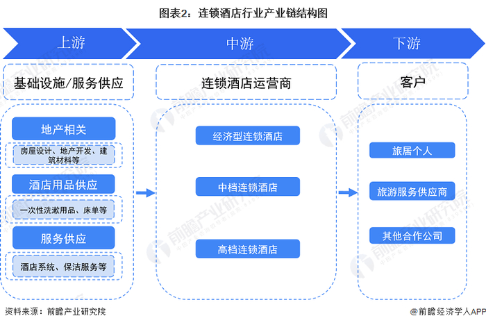 中国连锁酒店产业链上游主要包括地产开发、房屋设计、建材供应等地产相关供应商,洗漱用品、床单等酒店用品提供商,酒店系统软件、保洁人员培训等服务提供商等;产业链中游主要是各类档次连锁酒店运营商;下游主要包括个人以及旅游服务供应商等。