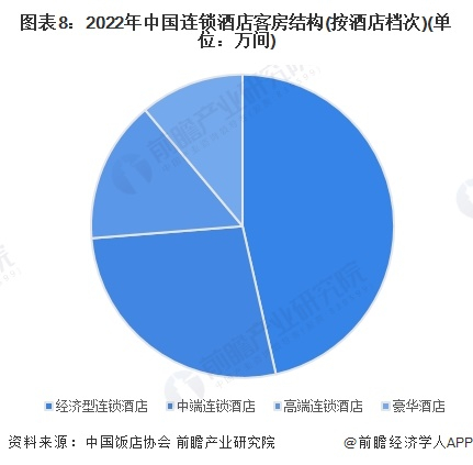 分酒店档次来看,根据中国饭店协会数据显示,2022年中国连锁酒店行业经济型酒店客房占比最高,达46%;其次是中端和高端酒店客房,占比约42%;豪华酒店客房占比约11%。