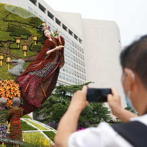 ▲9月25日,市民在北京西单一处花坛前拍照。图/新华社