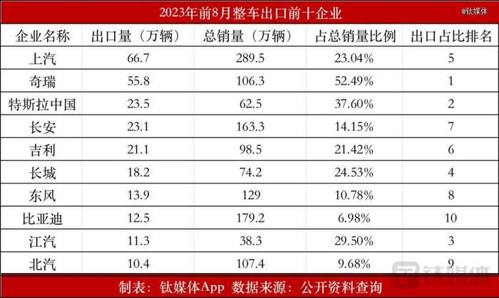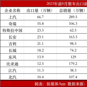 钛媒体App根据公开数据整理,1~8月整车出口前十企业的总出口量占到所有出口量的87.22%,这表明我国目前整车出口主要集中在头部企业。而出口前十企业中的一个显著亮点是,虽然比亚迪的出口占比排名末尾,但却是其中出口增长最快的一个企业。比亚迪前8月出口12.5万辆,同比增长高达6.5倍,增速位居前十车企首位。