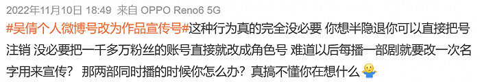 哪怕是复出阶段,吴倩依旧任性。陷入舆论漩涡后不久就退网,将个人微博号改为角色宣传号。老粉无言以对,新粉一头雾水。