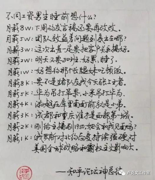 仔细看看上面的例子。月薪8w想的是改发言稿,可以看出是指领导层;月薪3w,企业中层,薪水已经超出大多数人,但仍要为更高的薪水奔波,所以想着搞好客户关系也是合理的;月薪1w,不上不下,想的是爱情,但也还只限于吃饭,更进一步的想法还需要更进一步的薪水支撑。但月薪1k的人,真的是在想国际政治吗?