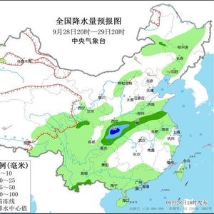 9月28日20时至29日20时,川西高原北部、四川东北部、重庆中北部、陕西东南部、湖北西北部、河南中部、安徽北部、江苏北部、云南南部等地部分地区有中到大雨,其中,陕西南部、湖北西北部、四川东北部、重庆北部等地局部地区有暴雨(50~80毫米)。内蒙古中部、辽宁中部、西藏北部、河北北部等地部分地区有4~6级风(见图1)。