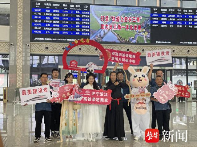 “来,拍张照!”“给我也来一张!”站房中央的时刻表大屏前,不时有首发车乘客打卡留影,更有热情的建设者扮成嫦娥、吴刚,给一早到达大厅的乘客派发起中秋月饼,喜悦之情洋溢在每一张笑脸之上。