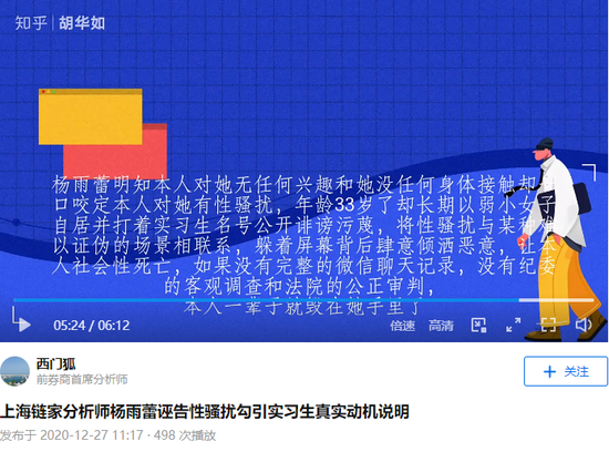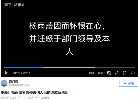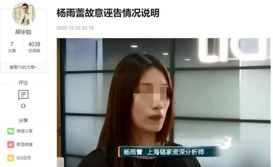 此外,杨梦琛律师还提到,2020年12月26日,胡华如在搜狐网上发表了文章《杨雨蕾故意诬告情况说明》等内容。这篇文章包含了“杨雨蕾主动加本人微信,并发送其个人简历,后发现其简历显示在东北证券的行研经历为三年,而中国证券业协会查询的信息显示只有九个月”“杨雨蕾在西南证券贡献的佣金完全无法覆盖其个人工资支出,工作能力不匹配分析师工作要求,工作态度也十分消极”等对杨雨蕾工作经历事实的描述以及能力的评价内容,如果没有相应足够的证据支持上述事实的话,则存在胡华如以诽谤、侮辱等方式侵害他人名誉权的可能。