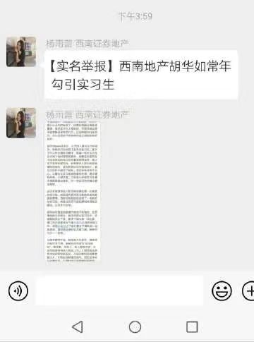 事情还要从2019年1月说起,西南证券研究发展中心房地产研究小组的杨雨蕾在“西南华夏核心研究群”等多个微信工作群及朋友圈发布“【实名举报】西南地产胡华如常年勾引实习生”实名举报信息。