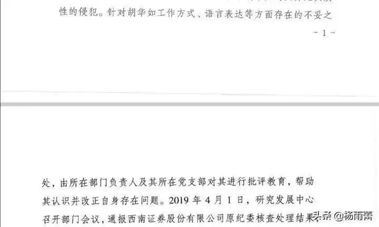 这件事在社交媒体上一曝光,西南证券就成立了调查组。根据判决书可知,西南证券纪检检察组曾给法院回函称:针对胡华如工作方式、语言表达等方面存在的不妥之处,由其所在部门负责人及党支部对其进行批评教育,帮助其认识并改正自身存在问题。但是该公司内部调查组并未认定胡华如存在性骚扰杨雨蕾及其他女同事的情况。