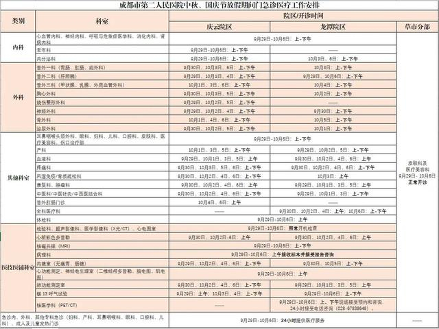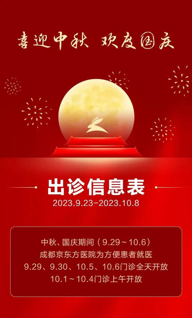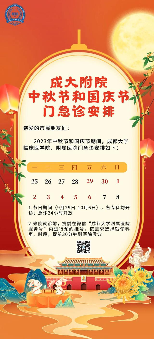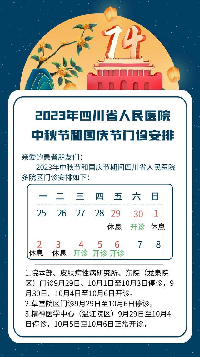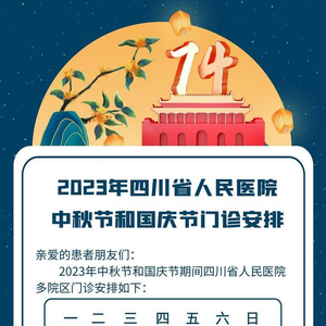 根据《国务院办公厅关于2023年部分节假日安排的通知》(国办发明电(2022)16号)文件精神,结合医院实际情況,医院门诊中秋、国庆放假安排:2023年9月29日(星期五)、10月1日(星期日)、10月2日(星期一)、10月3日(星期二)华西坝院区和温江院区门诊(包括门诊采血及相关辅助检查科室)停诊4天。门诊停诊期间,急诊、线上门诊照常运行。