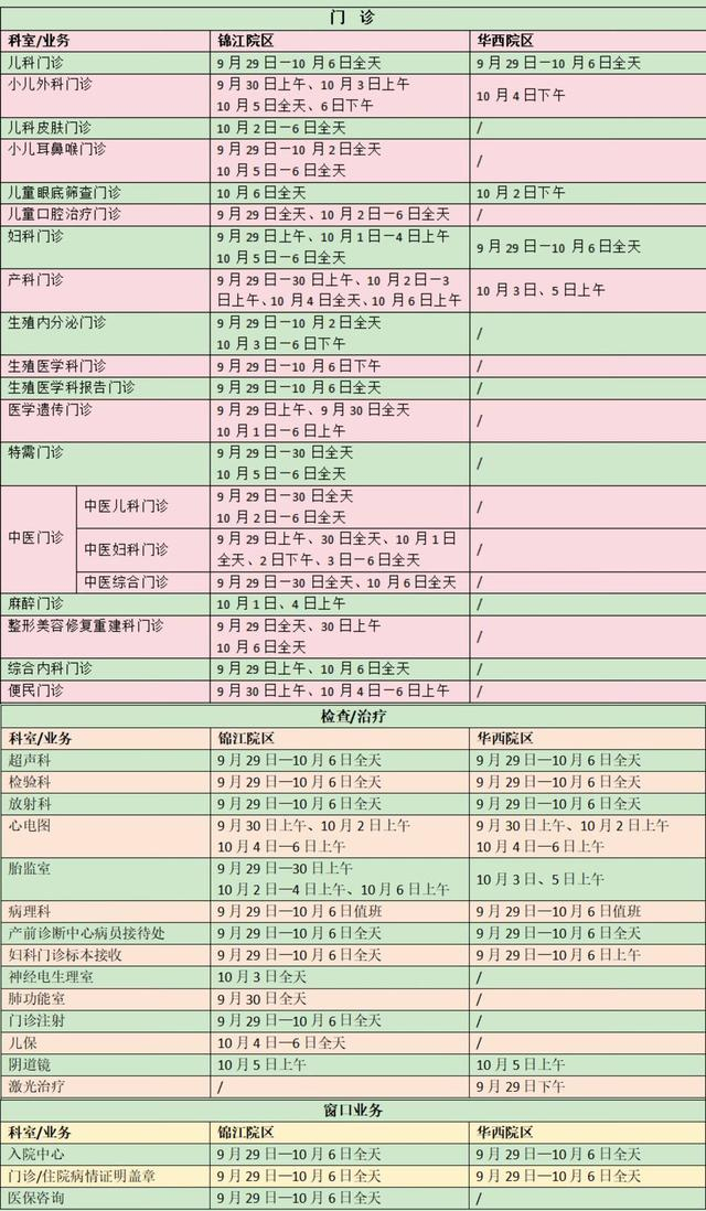 产科、小儿内科、新生儿科正常开诊,妇科每日上午开诊、医学遗传与产前诊断科9月29日、10月6日全天开诊,其余科室均不开诊。