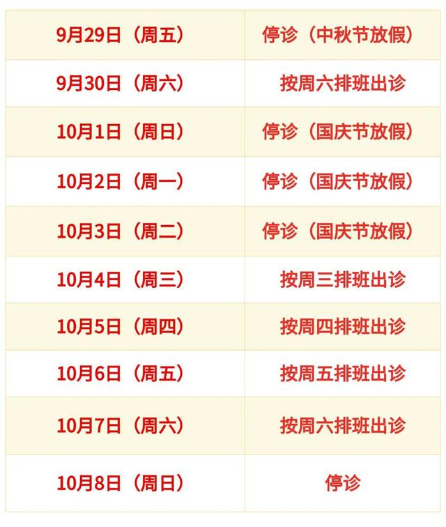 体检中心:9月29日——10月4日全面停诊,10月5日——10月8日正常开诊。