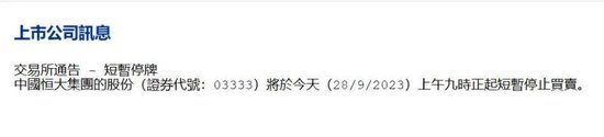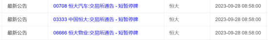 9月28日早间,港交所通告,中国恒大、恒大物业和恒大汽车纷纷披露公告,于今天上午九时正起短暂停止买卖。
