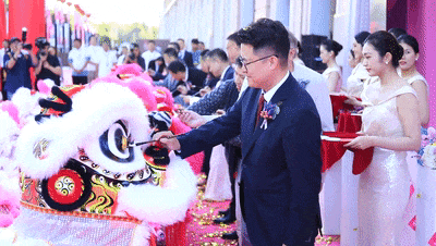 在热闹的舞狮表演中