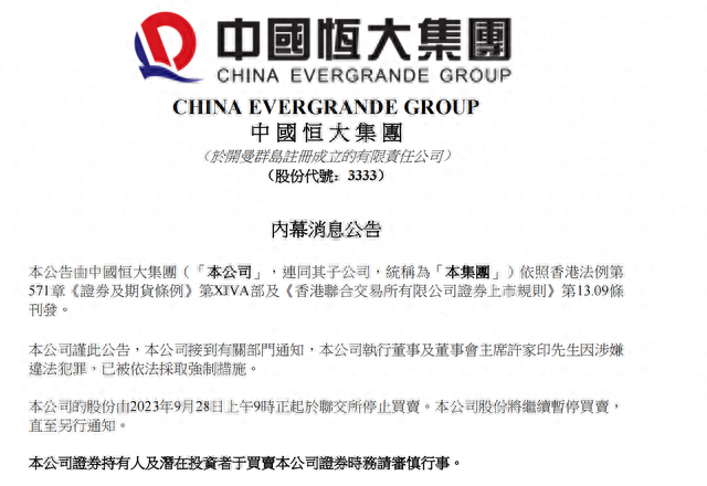 9月28日晚间,中国恒大(03333.HK)在港交所发布公告称,“本公司接到有关部门通知,本公司执行董事及董事会主席许家印因涉嫌违法犯罪,已被依法采取强制措施。”