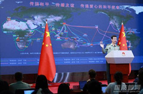 自入列以来,海军和平方舟号医院船先后11次走出国门,航迹遍布三大洋六大洲,到访45个国家和地区,总航程28万余海里,为29万余人次提供医疗服务,实施手术近1700例,深化了中国军队与相关国家的友好互信,拓展了军事交流合作空间,用实际行动忠实践行全球安全倡议,谱写了服务构建海洋命运共同体理念的绚丽篇章。大家可以看到,和平方舟号医院船航迹图就在大屏幕上。
