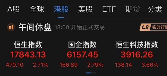 早盘港股高开后快速拉升,截至午间收盘,恒生指数涨2.71%,恒生科技指数涨3.66%。