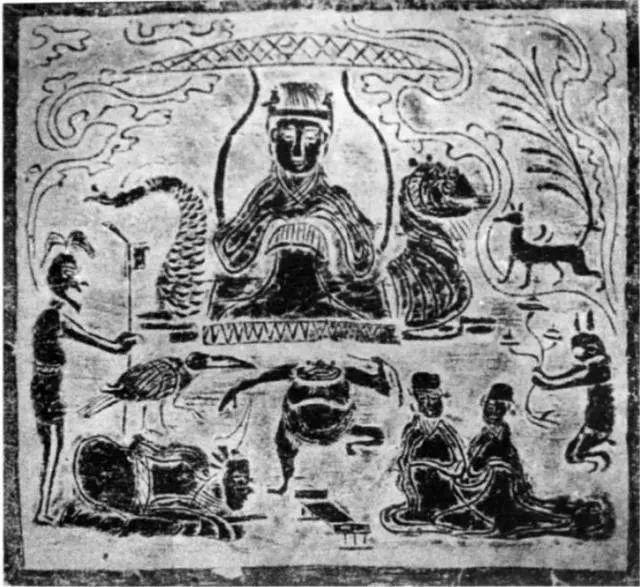 汉代画像石中西王母图像,西王母右侧竖起鸡毛掸子一样尾巴的便是九尾狐,而在它下方手持灯台的便是玉兔。