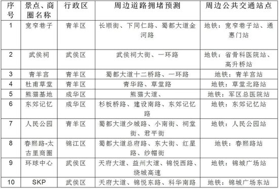 预计假期期间成都市出行热度较高的景点和商圈有宽窄巷子、武侯祠、青羊宫、杜甫草堂、熊猫基地、东郊记忆、人民公园、春熙路-太古里商圈、环球中心、SKP等。