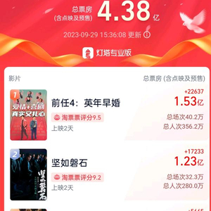据灯塔专业版,截至9月29日15时30分许,本周五单日票房前四名为《坚如磐石》《前任4:英年早婚》《志愿军:雄兵出击》《莫斯科行动》。