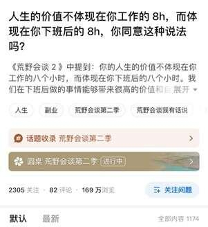 在节目之外,网友们有着更多叙述和探讨。在第6集节目播出后,一条相关问答迅速登上知乎热榜——“人生的价值不体现在你工作的8h,而体现在你下班后的8h,你同意这种说法吗”。在1174个回答中,同意的占比60%,不同意的占比34%,另外有6%保持观点中立。知乎答主“弗兰克杨”在回答里写道,人生价值的体现,其实跟你上什么班、下班又去做什么并没有直接关系,“而是在你自我设定的意义体系里,你做了几件符合你意义体系价值的事情”。